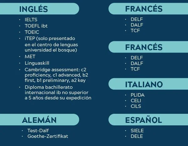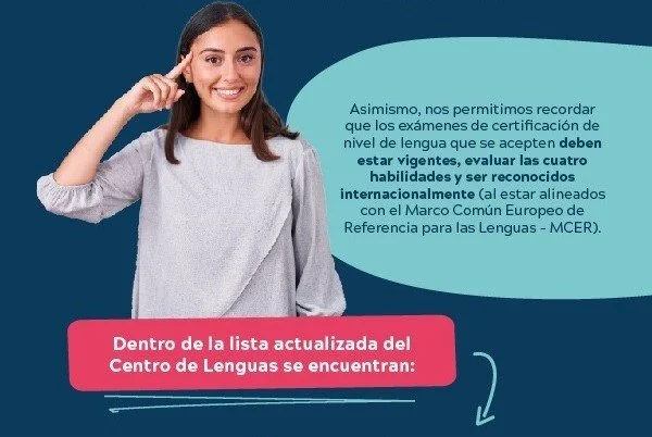 El Centro de Lenguas valida exámenes internacionales vigentes que certifiquen tu nivel de inglés. Recuerda que si deseas presentar alguno de ellos, debes tener en cuenta que evalúe las 4 habilidades del conocimiento y que se caractericen por su reconocimiento a nivel internacional.